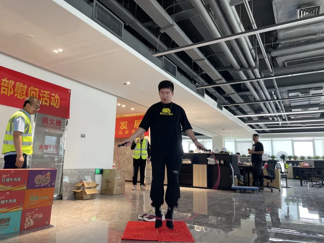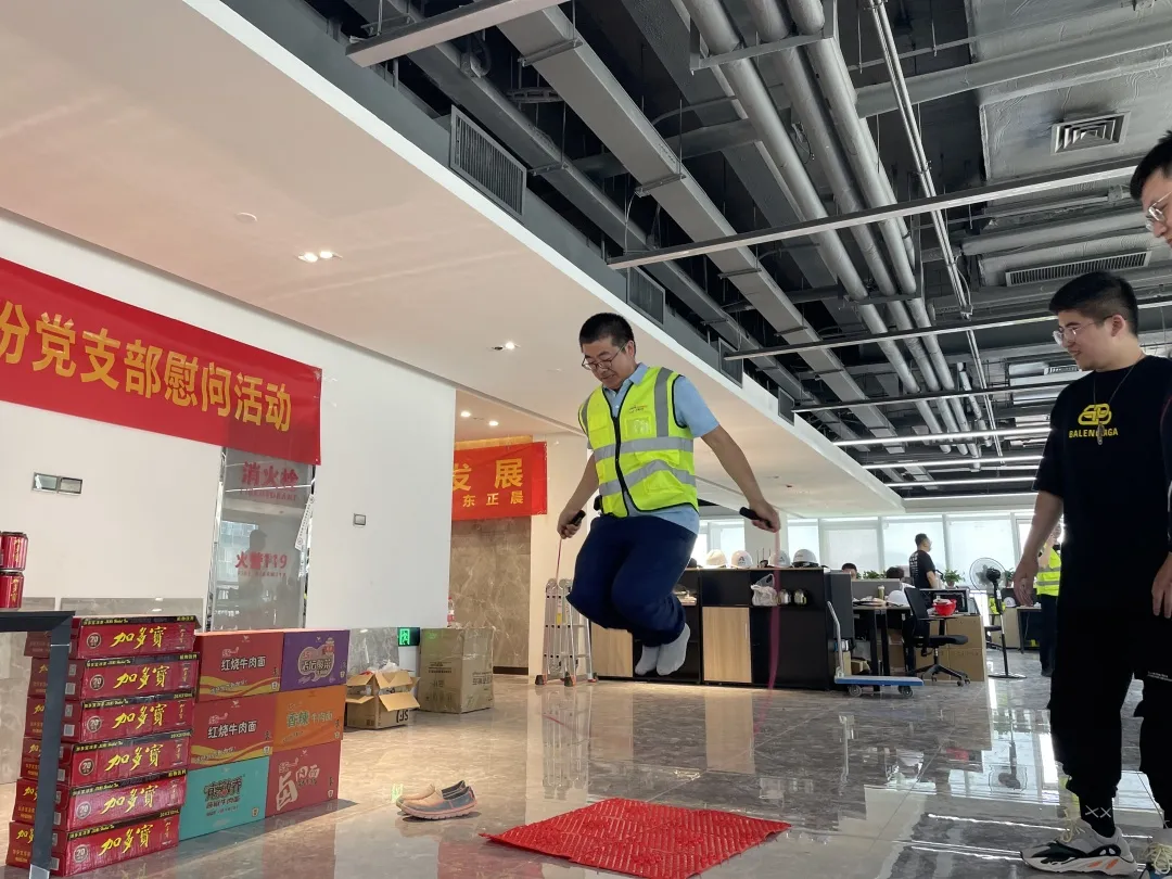 紧接着进入了互动游戏环节,乐动股份党支部准备了筷子夹豆子挑战、指压板跳绳、吃西瓜大赛等游戏与项目职工共度欢快节日。